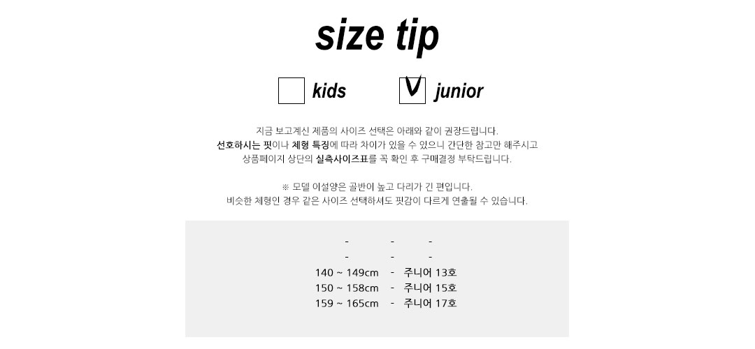실측(단위:cm) | 주니어 13호 | 주니어 15호 | 주니어 17호 |